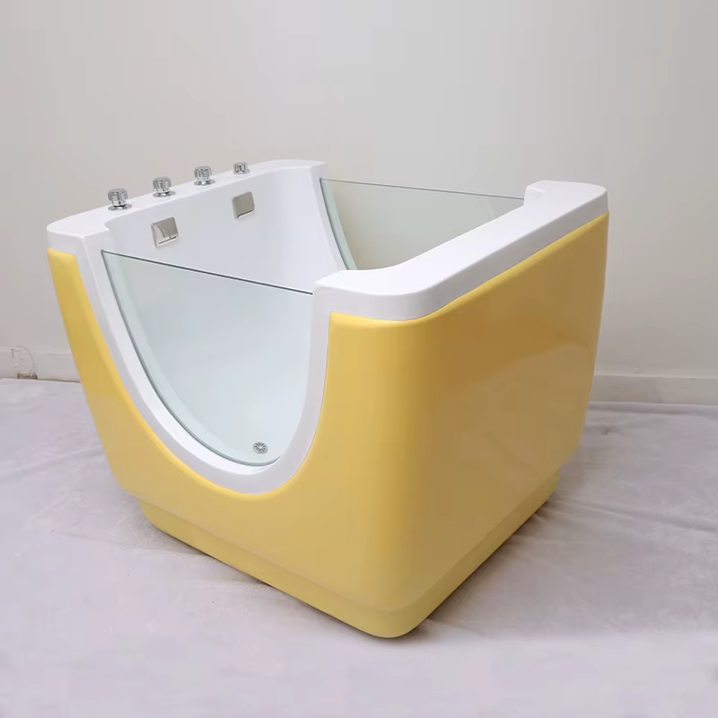 This modern baby bathtub combines comfort, safety, and style with its ergonomic design and transparent side panel for easy monitoring. Equipped with gentle water jets, it offers a soothing bathing experience, ideal for relaxation and hygiene. The built-in faucet, controls, and handheld shower make it user-friendly for parents while ensuring a spa-like bath for babies.