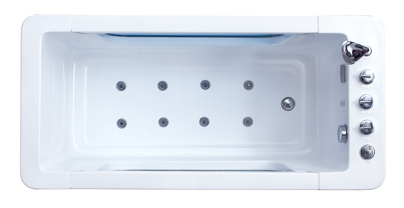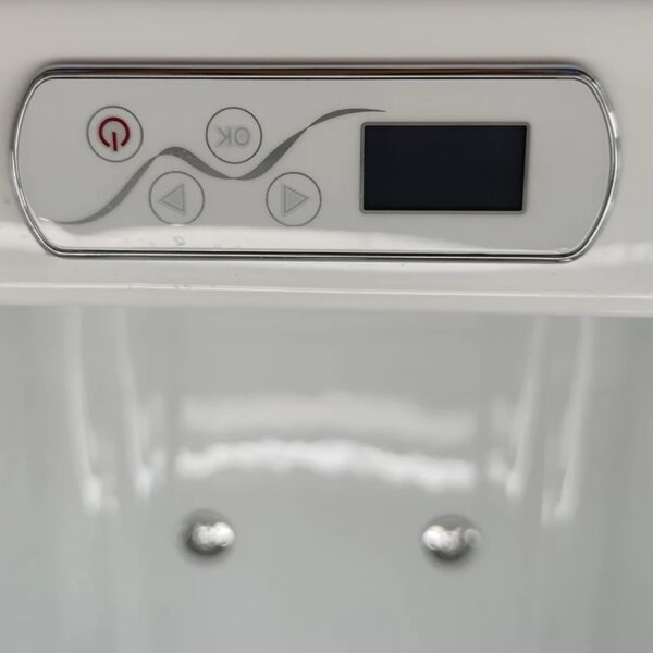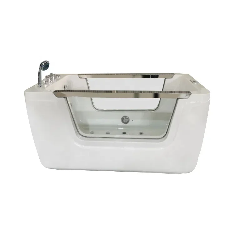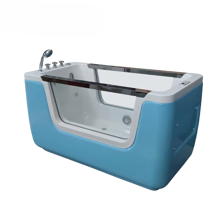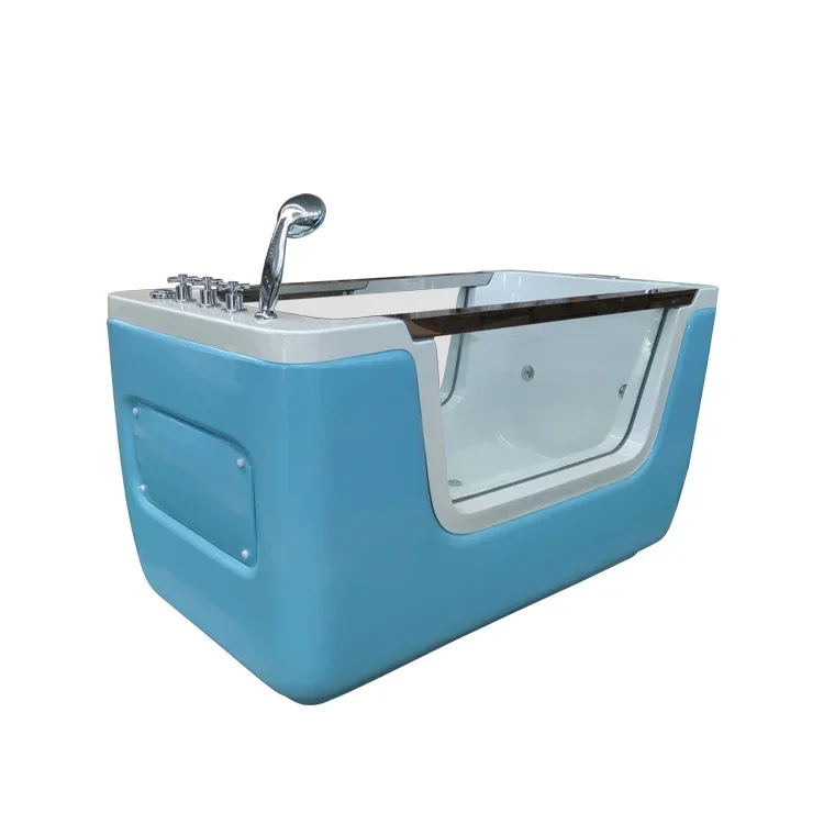 This is a modern baby bathtub with a stylish blue and white design and a transparent front panel, allowing parents to easily monitor their baby during bath time. The tub has a built-in faucet and handheld showerhead, providing convenient water control without extra accessories. Its spacious interior is suitable for infants and toddlers, while the ergonomic shape ensures comfort and safety. The transparent side adds a contemporary look and enhances visibility, making bath time more interactive. The raised edges help contain water, and the durable construction ensures long-lasting use—ideal for both home and professional baby care environments.