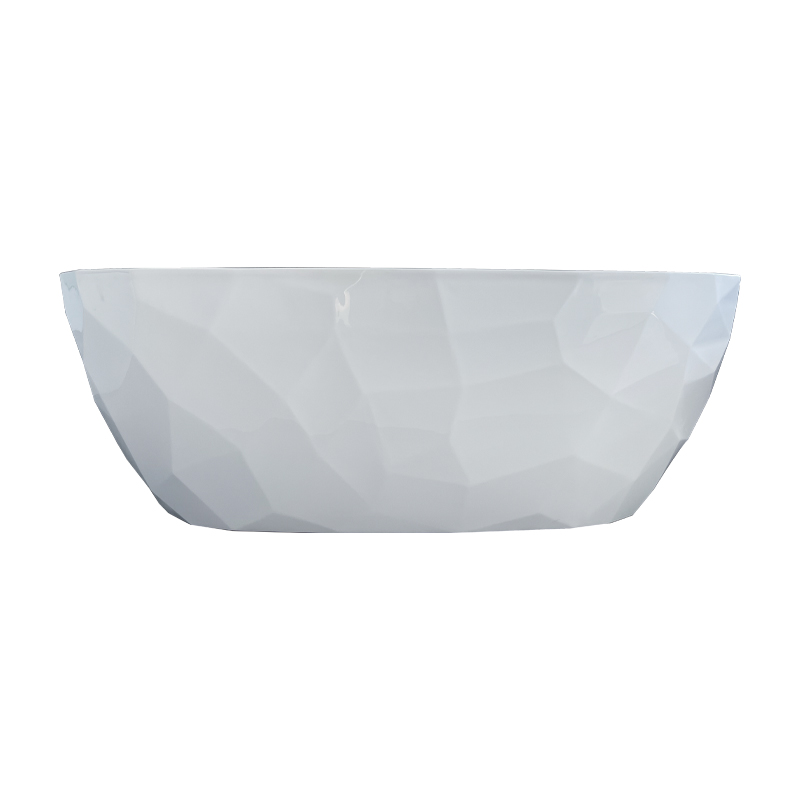 This freestanding bathtub features a striking geometric design that blends modern artistry with luxurious functionality. Crafted from a solid surface material, its angular, faceted exterior creates a sculptural statement that enhances any contemporary bathroom. The smooth matte finish adds a refined touch, while the deep basin offers a relaxing and immersive soaking experience. Designed for both visual impact and comfort, this bathtub exemplifies minimalist elegance and architectural sophistication. Perfect as a centerpiece in a modern home or spa-inspired retreat, it combines form and function seamlessly, transforming everyday bathing into a truly indulgent experience.